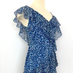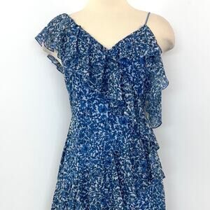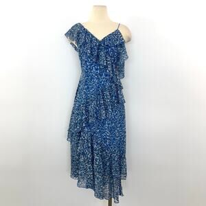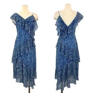 Alice + Olivia Olympia Asymmetrical Ruffle Silk Midi Dress Blue Floral 4 NWT