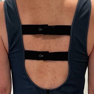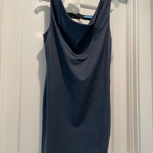 Navy/Denim (Color) dress, Stretchy knit material, Unlined, Staps in back with snap closure and exposed zipper. 71% cotton, 23% Nylon, 6% Spandex