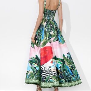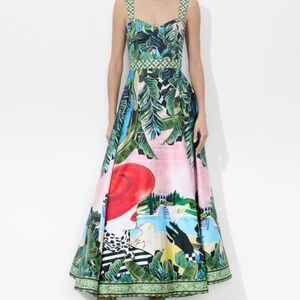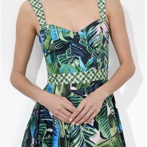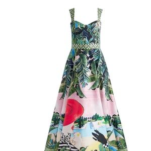 This fabulous weighted and flared dress with pockets has been worn once for 4 hours for my daughters wedding. It is a never altered size 8. It is fabulous! Colorful with tropical print, pink sky and all the fun bold graphic you would expect from Alice + Olivia. Is a maxi for 5'6" and under, could be a midi if taller. Fun dress for an occasion!