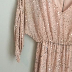 Elegant mini dress with shimmering sequins. Features a V-neck and gathered waist. Perfect for special occasions.