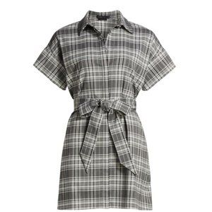 Plaid mini shirt dress with matching self-tie belt to accentuate the waist.