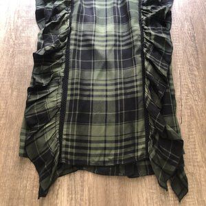 Super adorable blouse that I never wear because the sleeves don't work on me! I love this blouse though. I WANT it to work. Medium army green (looks lighter in photo) with black plaid. Black embroidery at the ruffles which extend from bottom of front to over the shoulder to the bottom of the back. VERY well made. S/P. Ruffles are amazing and the covered buttons are so classy. 100% Viscose - feels warm and perfect for the coming fall for layering. LOVE! Excellent condition.