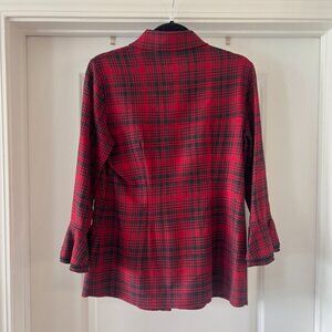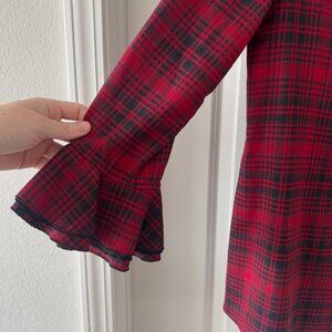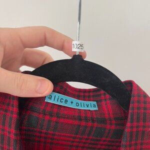 Make a statement with this eye-catching Alice + Olivia plaid blouse in a flattering Size 8. Featuring a timeless red-and-black tartan pattern with playful ruffle cuffs, this top effortlessly blends classic charm with modern flair.