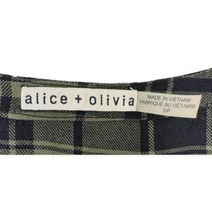 The Alice + Olivia blouse showcases a captivating blend of green and black hues, enhanced by elegant ruffled and asymmetrical details. This top offers a unique twist on classic style, making it a versatile choice for both casual and business casual settings. Crafted with attention to detail, it promises a chic and sophisticated look. Size Small