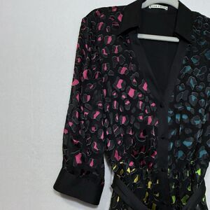Alice + Olivia Raja Burnout Rainbow Leopard V-Neck Mini Shirt Dress Size 10 Lined 3/4 Sleeve Button Front Self Tie Sash Belt