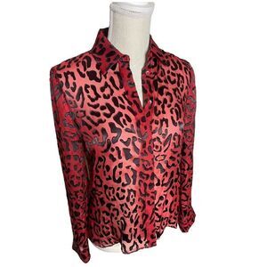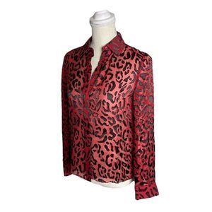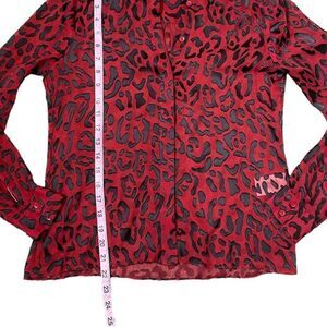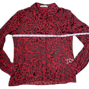 Alice + Olivia Red Willa Placket Leopard Burnout Blouse. Bold leopard print in sheer red background with black velvety burnout. Placket design with lux silk fabrication and refined cut. Shirt collar, long sleeves. Semi sheer. Silk/Viscose blend. Dry clean. Measurements in pictures.