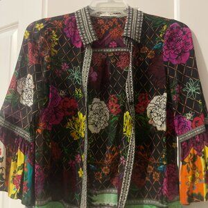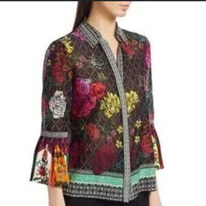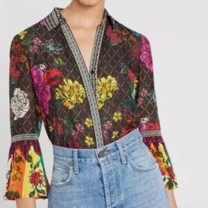 Alice + Olivia Rivera Floral & Diamond Print Silk- Blend Bell Sleeve Blouse