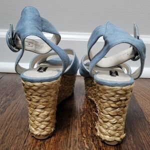 Roberta wedges by Alice + Olivia. Light blue denim uppers. Adjustable buckle ankle strap wrap. 3.5" heel, 2" platform.