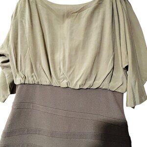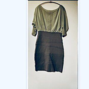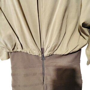 This stylish Alice + Olivia dress features an elegant silk bodice and a fitted bodycon/bandage-lite skirt, perfect for any occasion from casual outings to evening events. The olive green hue adds a touch of sophistication, while the lightweight fabric ensures comfort.The sleeves are ruched for elegance and the back zips at the skirt, opens a bit in the upper, and closes at the neck with a button.