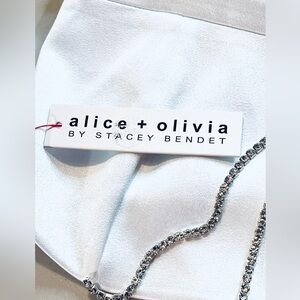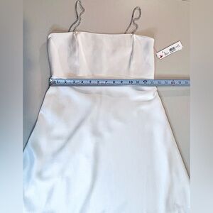 Alice + Olivia Sutton Crystal-embellished Mini satin finish Dress. This dress is mini-length, white satin dress with crystal-embellished shoulder straps. Square neckline, Satin finish, Empire seam, Fitted bodice, Back zipper closure, 75% triacetate, 25% polyester, Fits true to size. Dry clean only.
