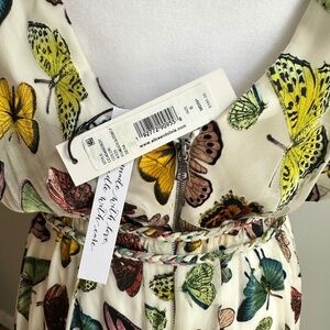 Alice + Olivia's maxi dress showcases a burnout butterfly motif on a satiny silk-blend backing. Braided at the shoulder straps and self-tie belt, this piece flaunts a flattering surplice bodice.