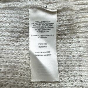 This light gray open knit sweater from Alice + Olivia x Scoop features a soft mohair wool blend in a light grey / silver oatmeal colorway with subtle tiny iridescent sequins throughout, basket-weave detailing, a rounded neckline, and ribbed trim. 54% polyester 20% acrylic 14% polyamide 6% mohair 6% wool