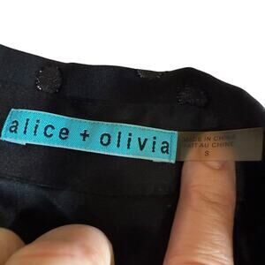 The Alice + Olivia Sheer Black Polka Dot Silk Blend Blouse in size S exudes a romantic and goth-like vibe, perfect for those who appreciate a touch of witchy style. The long sleeves, collared neckline, and button closure add a classic touch to this sheer blouse, making it suitable for various occasions such as parties, casual outings, and even business meetings. Made from a luxurious silk blend material, this blouse features puff sleeves and a regular fit with a designer brand name that adds a touch of elegance to any outfit. Perfect for the warmer seasons of spring and summer, this black polka dot blouse is a versatile and chic addition to any wardrobe.