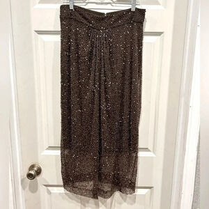 Beautiful brown silk skirt with beads. Silk skirt with poly blend king. Lining does not go the entire length of the skirt, so the hem line is sheer. Draped.