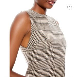 Excellent condition chic sheath dress by Alice + Olivia showcases a ribbed texture in a refined tan hue, ideal for both work and cocktail settings. Its sleeveless design and crew neck offer a contemporary flair, while the mini length adds a playful touch to your ensemble.