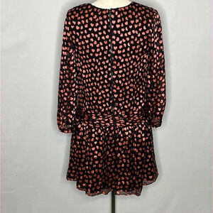 Alice + Olivia Tessie Drop Waist Heart Print Silk Blend Dress - Size 8. Excellent pre-owned condition. Flocked chiffon with heart pattern. long sheer blouson sleeves with heart button at cuff, drop waist, V neckline, back zipper with hook & eye closure, silk & viscose blend shell fabric. Approximate measurements: 19" bust, 17" drop waist, 34" length.