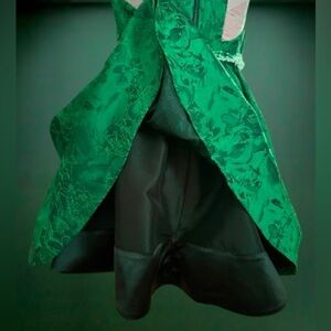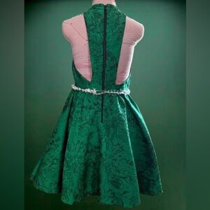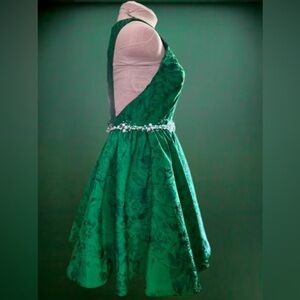 This is a very gently pre-loved Alice+ Olivia Damask/Jacquard, fit and flare dress. Its timeless emerald green damask fabric has been designed into a classic fit and flare style skirt. The body of the dress starts with a contemporary tweak… a front halter-style neckline … and ends with a racer-back finish, behind! The dress’s skirt flare stays right in place due to an approximate 4” stiff, finished edge on linings hem.