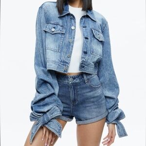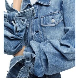 We are loving bows this season. She features a super cropped length, extra long sleeves with oversized bows and a perfect vintage blue wash. The proportions of this piece are just so, so perfect.