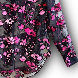 Features: Oversized fit, sheer design, ½ button-up, raised velvet floral texture