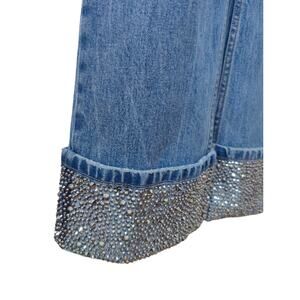 Alice + Olivia "Weezy" jeans in medium-wash brooklyn blue denim with rhinestone-embellished cuffs