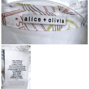 White/multicolour silk stamp print silk shirt from Alice + Olivia featuring stamp-effect graphic print, button-down collar, button fastening and buttoned-cuff sleeves.