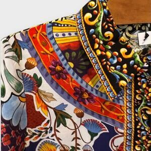 Light up your polished look with the riot of colorful prints splashed across the fine silk fabric that drapes this shirt cut with a classic button-up styling.