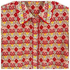 • Features: Piped trim • Vibrant designer print • Button front • Collared neckline • Luxe silk drape