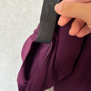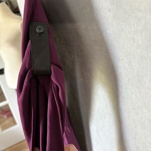 This Alice + Olivia dress in size M features a drape sleeve and faux wrap style, perfect for formal occasions. The knee-length dress is crafted from a soft, silky silk blend in a vibrant purple color. It has a round neckline and 3/4 drape sleeves, making it suitable for spring events. The dress is elegant and requires dry cleaning. It is pre-owned. Keywords: Alice + Olivia, drape sleeve, faux wrap, knee length, purple dress, formal wear, silk blend, elegant, spring fashion, women's dress, round neck, 3/4 sleeve, dry clean only, pre-owned. Missing a sleeve button and waist sash. No size tag, fits like a small. Feels like silk.