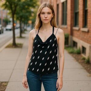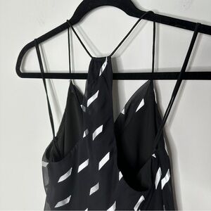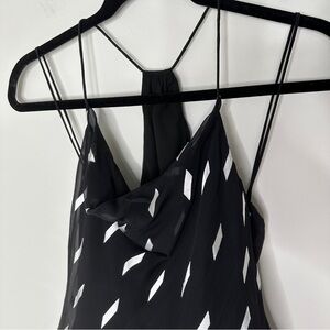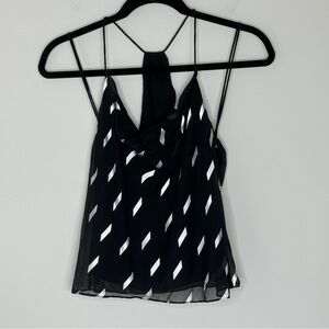 This elegant camisole from Alice + Olivia features a striking black and white design with an asymmetrical cut. The sleeveless, backless style offers a modern and sophisticated look, perfect for making a statement. Its flowing fit and thin straps add a touch of grace to any outfit.