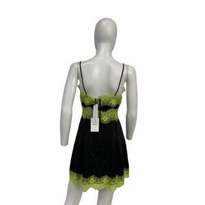 Alice + Olivia 'Zaira' Black Viscose Lace Trim Mini Dress Size 2: two-tone design, lace detailing, v-neck, spaghetti straps and rear zip fastening.