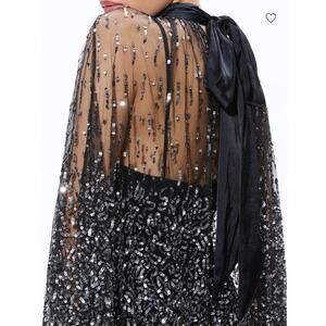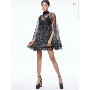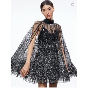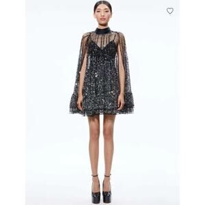 Elevate your wardrobe with this stunning Alice + Olivia Zenon Embellished Tie-Neck Cape Mini Dress. The black mini dress is adorned with beautiful embellishments and a tie-neck closure that adds a touch of elegance to the overall look. The dress is designed for women in size 2 and has a regular fit. The short dress length and stylish design make it perfect for any occasion.