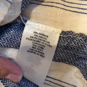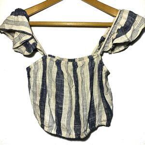 Alice + Olivia Celestia top has a short flutter sleeve and is cropped. It has a square neckline . It has blue and cream stripes on Linen fabric. It measures 13.5" chest and 16" length. Non-smoking home.