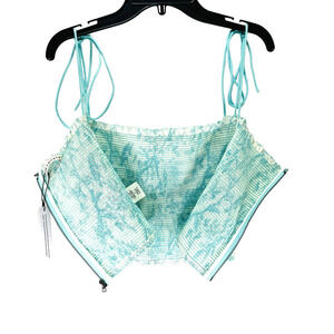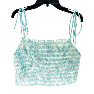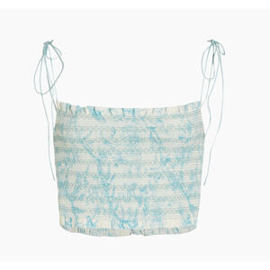 This fitted smocked top has an aqua blue dyed print, adorned with self-tie shoulder straps.