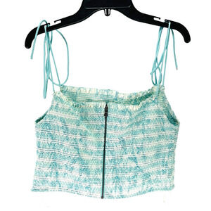 Have a great summer with this printed, blue, sleeveless crop top from Alice + Olivia. Very much a coquette vibe.
