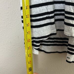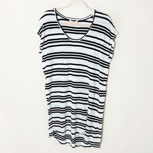 Lightweight jersey knit linen blend shirt sleeve t-shirt dress. Black and white stripes. Scoop neckline. Pullover style. Relaxed fit. No size tag but should be a small., I have provided measurements to compare with your own.
