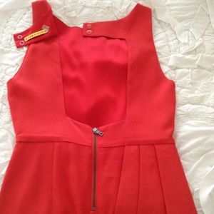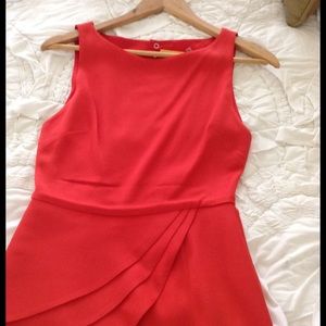 Red partial peplum with keyhole back cocktail dress. Dress is fitted and hits right above knee. She'll is viscose & rayon and liner is silk