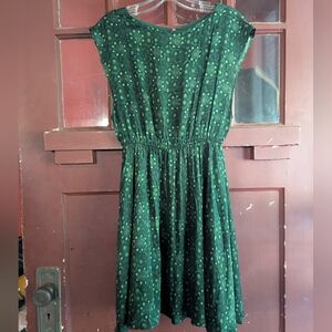 Euc, zip back, elastic waist, cap sleeves. Stretch silk material in a repeating floral print.