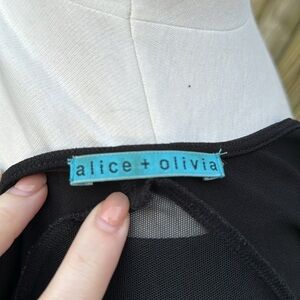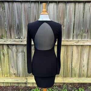 Alice + Olivia Black Long Sleeve Mesh Back Dress. Long sleeve, mesh layer dress with see through back. Fitted, bodycon. Stretch. Pullover.