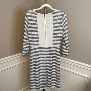 Minor snag in the sequins on the left side but is not noticeable when worn. It is worth noting that when I wore this the slip of the dress does peek out at the bottom but it could be different on each person. Size 10. Features sequence detailing throughout. Has three-quarter length sleeves as well as a zipper up the back. Met David Copperfield in this dress.