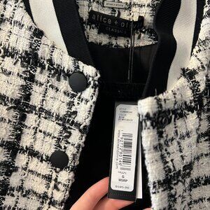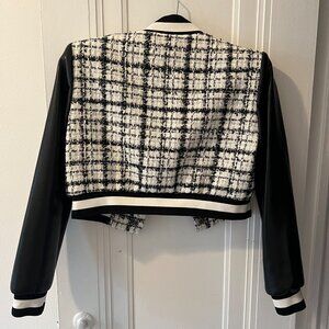 Alice + Olivia tweed and faux leather cropped bomber jacket