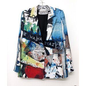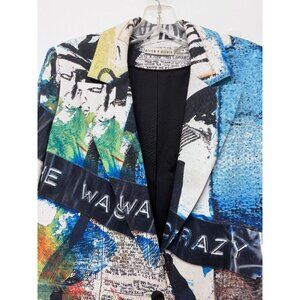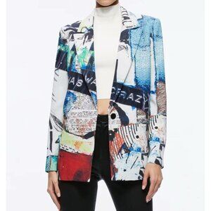 This Alice + Olivia x Basquiat Denny Blazer Jacket is in great condition! Features a painted effect print with a newspaper print and "He Was Crazy" text (print is called Confidential). Long sleeves, V neck / collared. There is a tiny snag on the back shoulder (see the last picture).