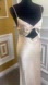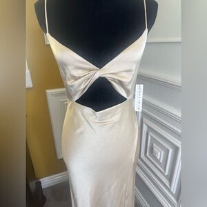 New without tags, there is a flaw tiny snag on the side that is noticeable than others as the material is very delicate but brand new. Stunning cream satin dress with a stylish cutout and thigh-high slit. Perfect for special occasions.