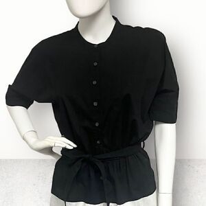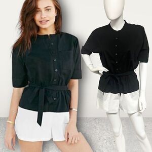 Poplin One Piece Button Placket Round Collar Short Sleeve Button Sleeve Attached Belt Side Pockets