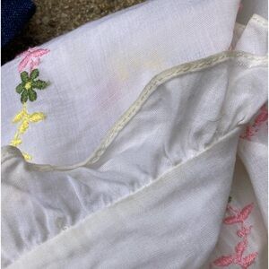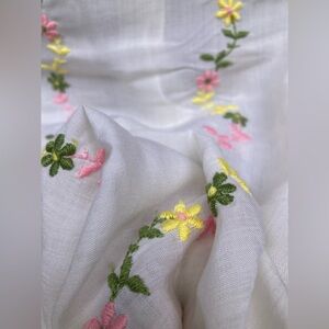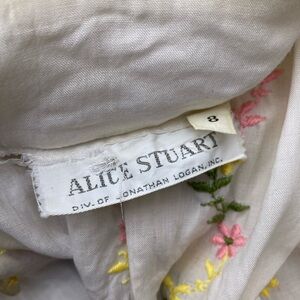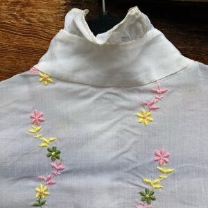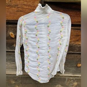 Made of high-quality fabric, this button-up top features embroidered flowers, ruffled collar and sleeves, and pearly buttons. I bought this with tags attached and never wore it, but it still has some small spots of discoloration (pictured). Might have a slight vintage mustiness. Alice Stuart Division of Jonathan Logan.