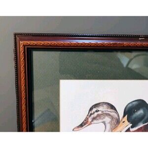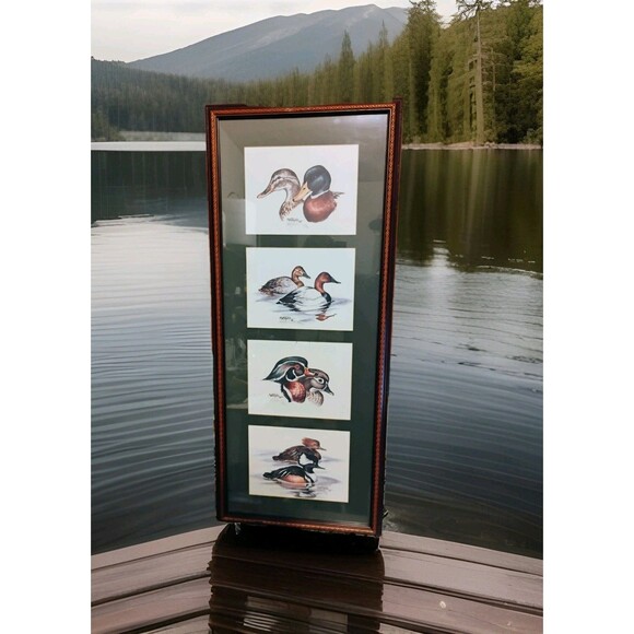 The product is a set of four signed and numbered duck prints by artist Alice Taylor, created in 1984. The prints feature mallards and are framed, measuring 33 inches in height and 14 inches in width.
