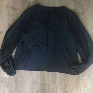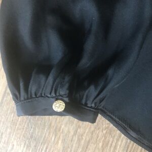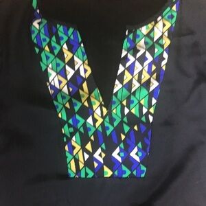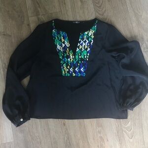 Great condition. Black with yellow, green, blue and white geometric pattern on the neckline. Slight balloon sleeves. Gold metal cuff button.
