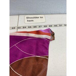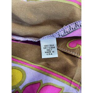 The Alice & Trixie Silk colorful 70's Blouse Top in size L features a geometric pattern in a vibrant multicolor design, perfect for a casual occasion. With a V-neckline and 3/4 sleeves, this blouse has a wide strap closure and is made of lightweight silk satin fabric. The tunic-style top with an open sleeve is ideal for the summer and spring seasons, adding a touch of festiveness and party-like atmosphere to your wardrobe. Designed in the United States, this blouse from Alice & Trixie is a stylish and colorful addition to any woman's clothing collection.