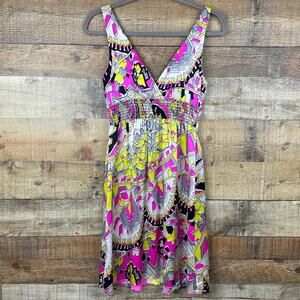 Alice & Trixie Sleeveless Dress. Size medium. White with a yellow, pink, gray, and black print. 100% silk. V-neck. Stretchy smocked back. Excellent condition. Measurements are in the pictures.