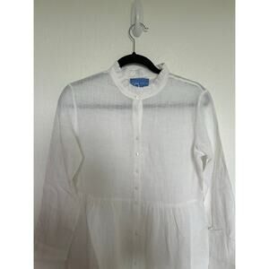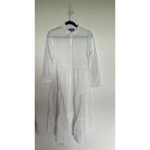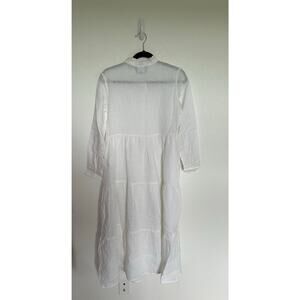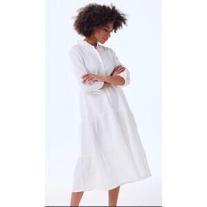 This dress is known for its effortlessly polished look. It is perfect for the minimalist or quiet luxury look. It is 100% lines. The fabric is smooth to the touch and breathable. The design is a long sleeve style with a tiered skirt. The collar is a chic ruffle collar. It buttons from the neckline down the front. It is unlined. It is new but the tag has been cut so it can not be returned.