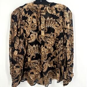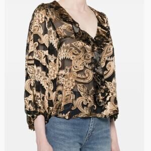 An intricate burnout design defines this elegant top. Its swirling paisley pattern has a rich golden sheen, set on a semi-sheer body. Blouson poet sleeves and a dramatic ruffle running down the bodice further the dark romanticism. Slip over a black camisole for the office, and a black bra for date night.